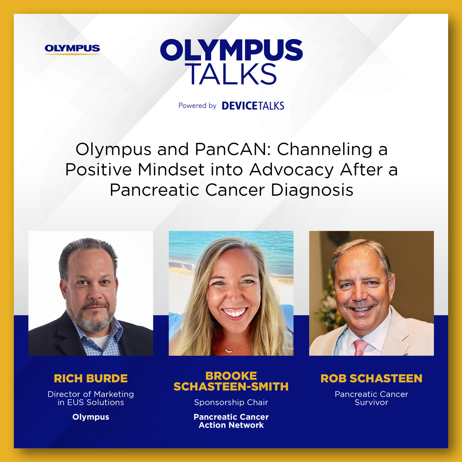 Keynote interview with Rich Burde, Director of Marketing, EUS Solutions at Olympus with special guests Rob Schasteen, a pancreatic cancer survivor, and his daughter Brooke Schasteen-Smith, Sponsorship Chair at the Pancreatic Cancer Action